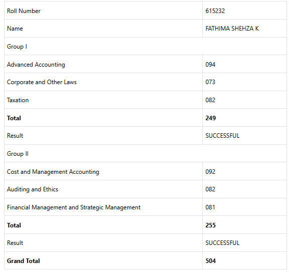 CA Intermediate January 2026 AIR 2 Marksheet: --- Fathima Shehza k