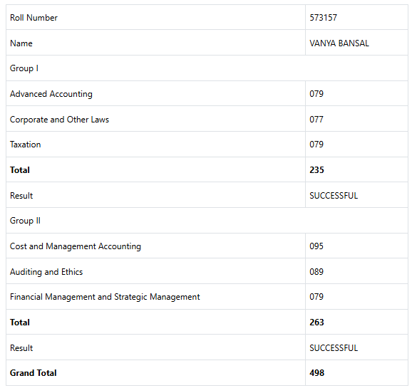 CA Intermediate January 2026 AIR 3 Marksheet: --- Vanya Bansal