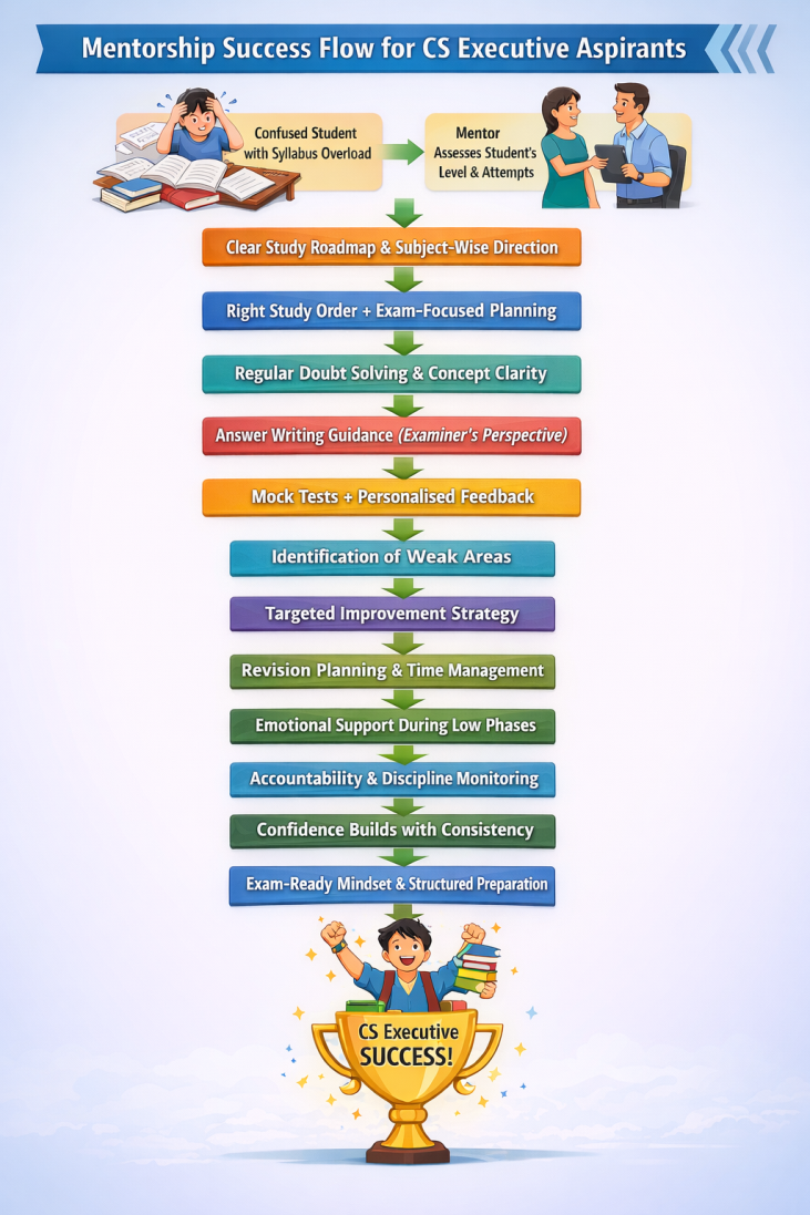 Ans: By providing customized study plan, clarifying doubts, and developing an exam-focused strategy; Mentorship not only helps CS Executive students but also increases their chances of success.